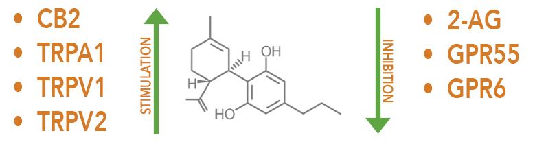 CBDV interacts with the endocannabinoid system to influence physiological functions, with scientific literature suggesting that it acts as an agonist of TRPA1, TRPV1 and TRPV2 receptors, an inverse agonist of GPR6, an antagonist of GPR55 and may be an inhibitor of endocannabinoid 2-AG production.
